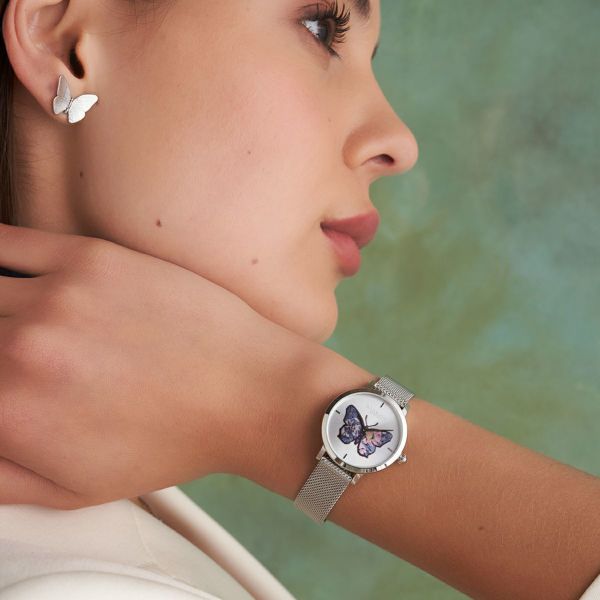 ヴィンテージプリントをイメージしたカラフルな模様の羽を持つ蝶が、その美しさは28mmのシルバーのサンレイ文字盤に見事に表現されています。超薄型ケースとメッシュストラップが、この腕時計を完璧に仕上げています。