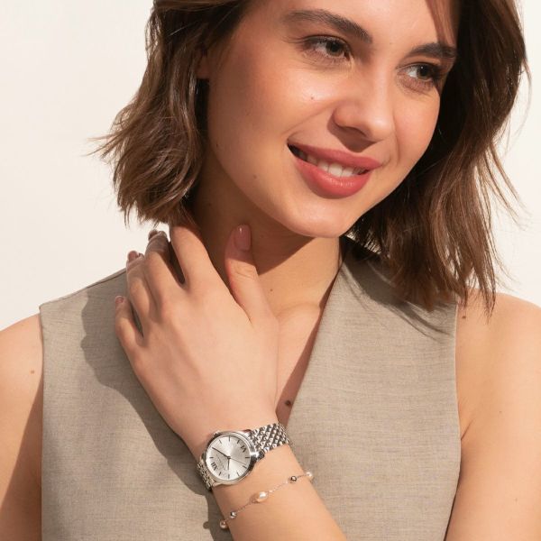 リューズにはイギリスの伝統的な花紋である「テューダー・ローズ」が刻印され、細部にまでこだわりを詰め込んだ日常のエレガンスを演出しています。