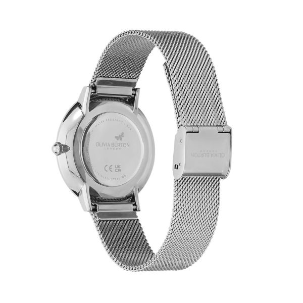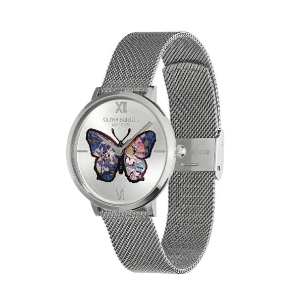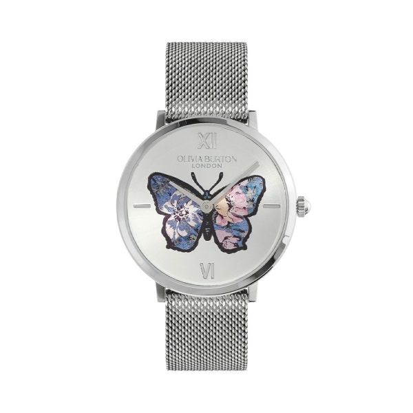 ヴィンテージプリントをイメージしたカラフルな模様の羽を持つ蝶が、シルバーのサンレイ文字盤を舞台に、飛翔しています。シルバー仕上げの超薄型ケースとメッシュストラップが、この腕時計を完璧に仕上げています。