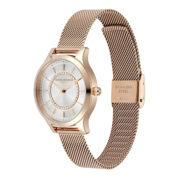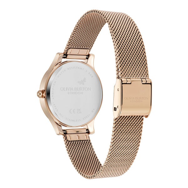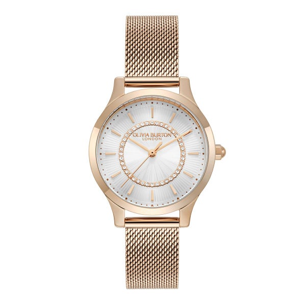 オリビア・バートンのアイコニックなワンダーランド・コレクションをベースに、ラグジュアリーに仕上げた「ワンダーラスト」コレクション。光り輝くサンレイ文字盤の中央にはサンバースト仕上げが施され、外縁には小さなゴールドのミニッツマーカーがあしらわれている。内側のマイクロパヴェクリスタルで、よりラグジュアリーで洗練されたスタイルに。