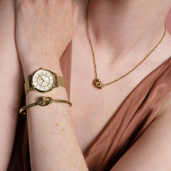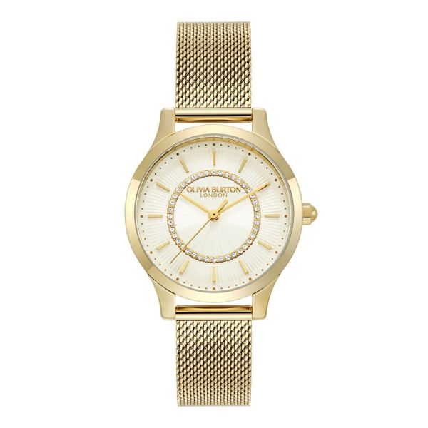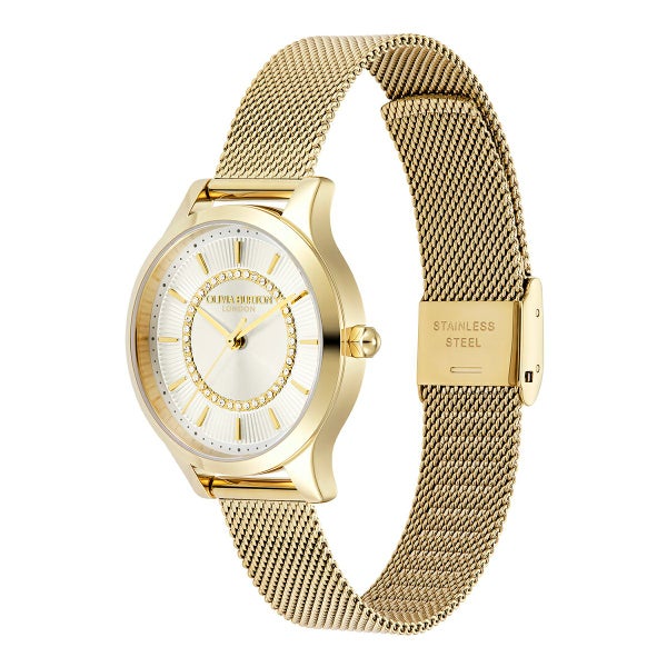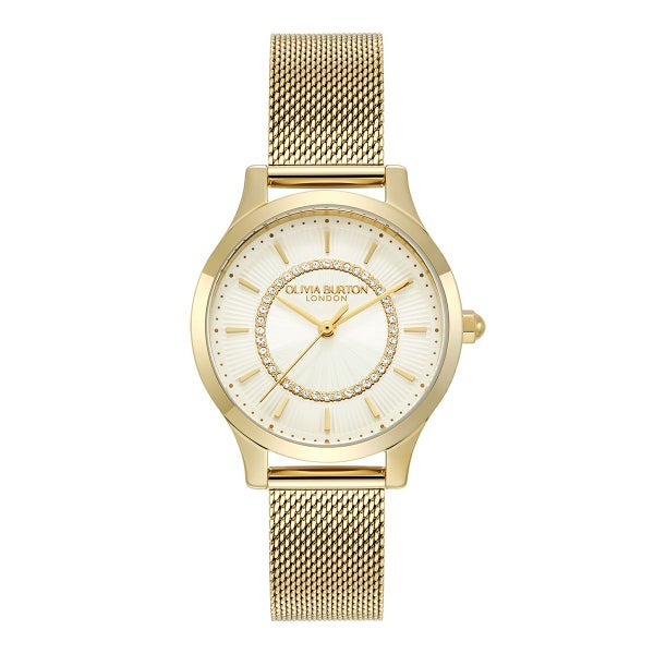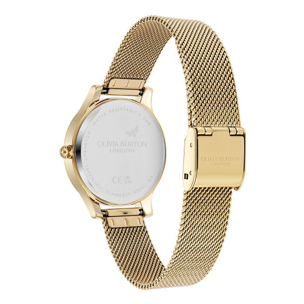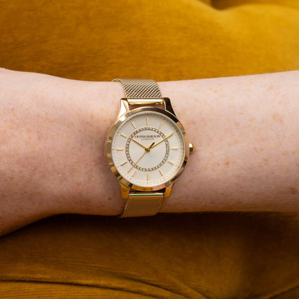 オリビア・バートンのアイコニックなワンダーランド・コレクションをベースに、ラグジュアリーに仕上げた「ワンダーラスト」コレクション。光り輝くサンレイ文字盤の中央にはサンバースト仕上げが施され、外縁には小さなゴールドのミニッツマーカーがあしらわれている。内側のマイクロパヴェクリスタルで、よりラグジュアリーで洗練されたスタイルに。
