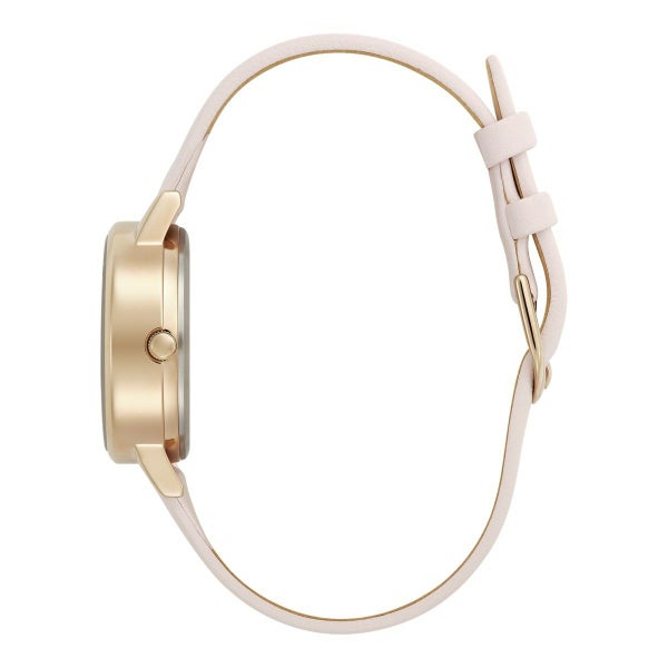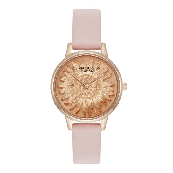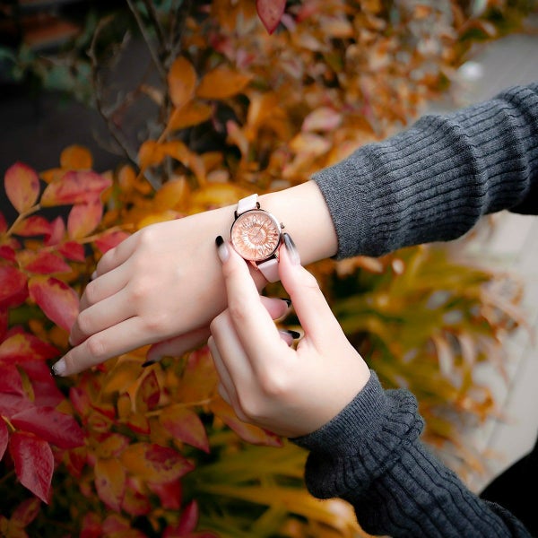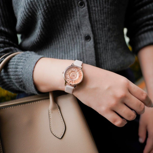 絆と希望を象徴する、存在感あふれるサンフラワーが最大の魅力。繊細な3Dモチーフは、刻み込まれた花びらとマイクロビーズが特徴で、メタリックなトーンの文字盤の中心に配置されています。トレンド感のある「マッシュルーム」カラーのレザーとローズゴールドのケースが、洗練された美しさを演出。このスタイルは、大切な方への贈り物や自分へのご褒美にぴったりです。