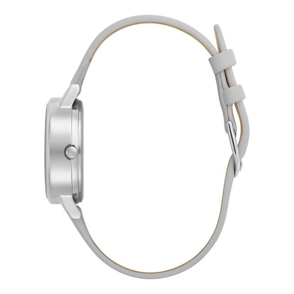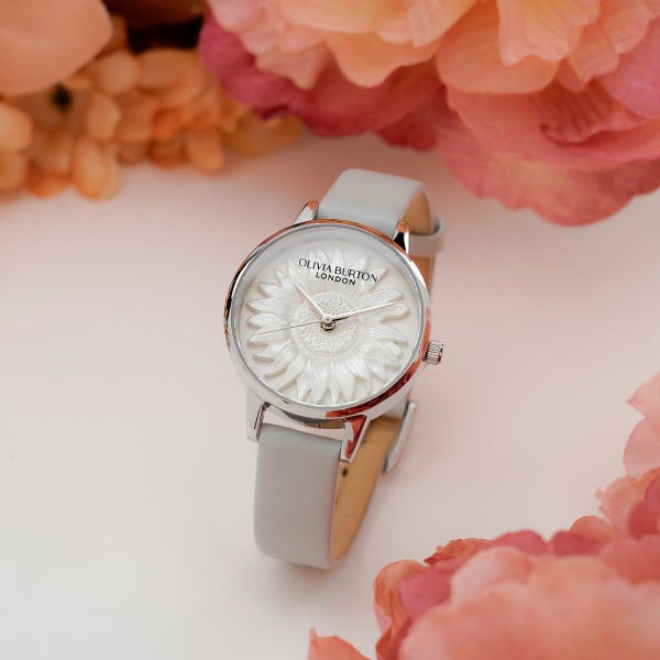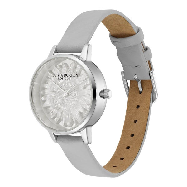 絆と希望を象徴する、目を引くサンフラワーが特徴のデザイン。刻み込まれた花びらとマイクロビーズで作られた繊細な3Dモチーフは、メタリックトーンの文字盤の中央に美しく配置されています。トレンドの「ライトグレー」カラーのレザーストラップとシルバートーンのケースが、この上品なスタイルを引き立て、贈り物や自分へのご褒美に最適です。