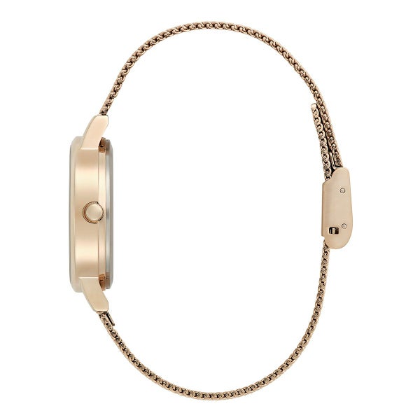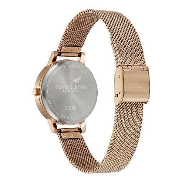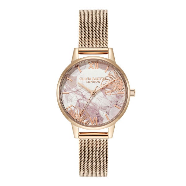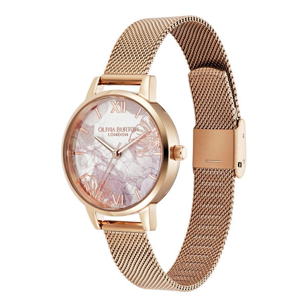 控えめなフローラルデザインが魅力の抽象的な文字盤。手描きの花々が織りなすマーブル模様に、繊細なメタリックエッチングがアクセントを添えています。スリムなケースとローズゴールド仕上げの洗練されたメッシュストラップが調和し、いつでもエレガントなスタイルを演出します。