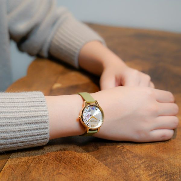 イギリスの田園風景を思わせるクラシックなフローラルデザインが特徴。色とりどりの花々と、その周りを飛び回るミツバチが描かれたダイヤルに、セージグリーンのレザーストラップとゴールドケースが調和し、クラシカルな印象を与えます。落ち着いた華やかさが手元を美しく引き立てる一本です。