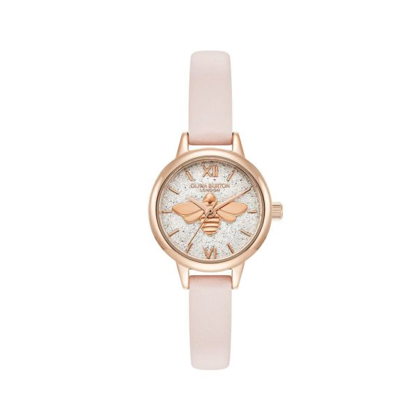 輝きを纏い、魅力的な文字盤を手に。シルバーホワイトグリッターの文字盤には、繊細なエッチングが施されたオリビア・バートンのアイコニックな蜂があしらわれています。ローズゴールド仕上げのクラシックなラウンドケースと上品なブラッシュレザーストラップが組み合わさり、どんな場面でも華やかな輝きを演出します。