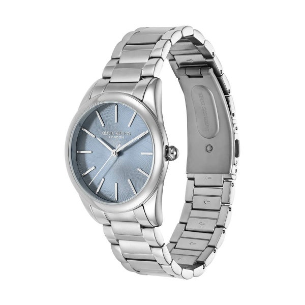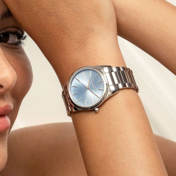 ミニマルなインデックスと洗練されたケース、中央をマットに仕上げたシルバートーンのブレスレットが、カラーの美しさをより引き立てます。