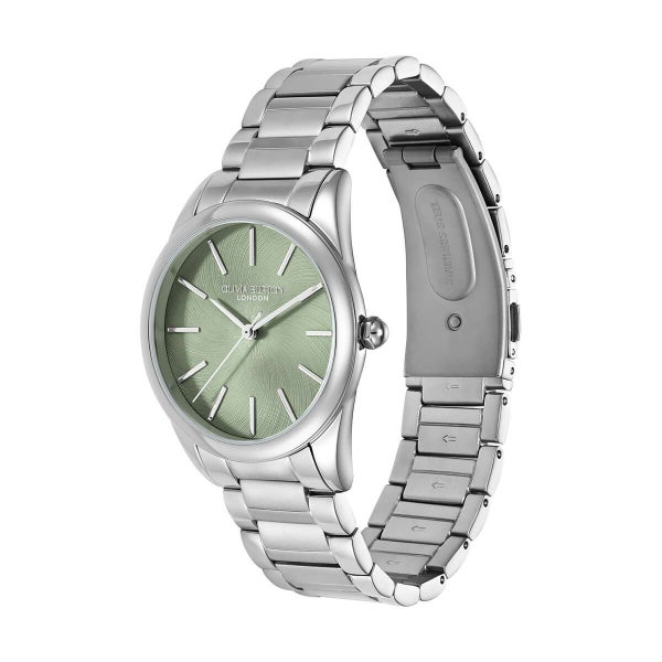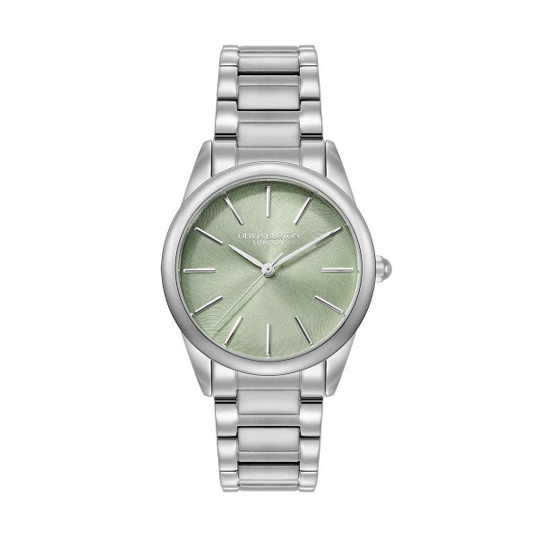 すっきりとしたケースにミニマルなインデックス、中央をマットに仕上げたシルバートーンのブレスレットが、カラーの魅力をいっそう引き立てます。