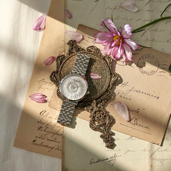 今回の新作では、ひと回り大きい35mmケースを採用することで、立体的な花びらのディテールがよりダイナミックに映え、手元に存在感をプラス。