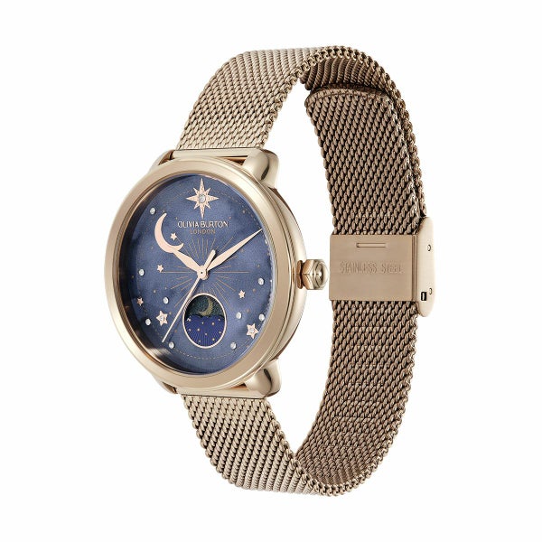 占星術のチャートから着想を得たデザインに、星々のきらめきを散りばめ、宇宙の神秘を手元に表現します。文字盤には北極星を示すマーカーと繊細なムーンモチーフ、さらに小さなクリスタルのスターバーストをあしらい、まるで夜空を切り取ったかのような仕上がりに。ムーンフェイズ窓にはスターバーストのテクスチャーと繊細な星の装飾を施し、他にはないユニークな特徴となっています。