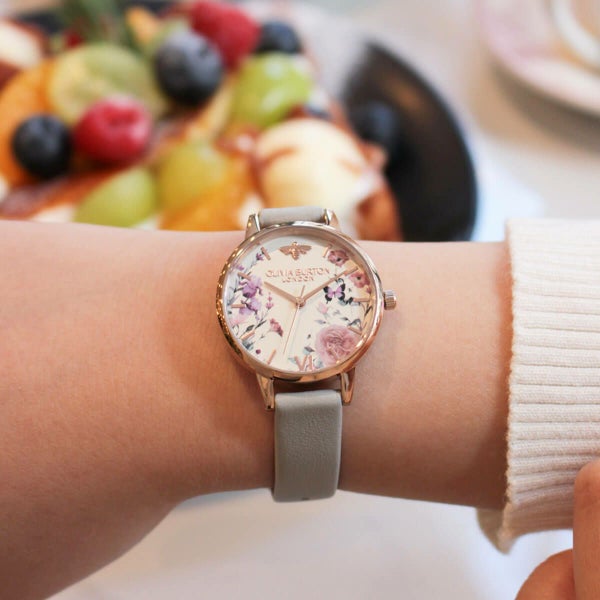 ブランドを象徴する繊細な手描きのフラワーモチーフが、まるで冬の庭の花々をそのまま閉じ込めたように文字盤いっぱいに広がり、柔らかな光をまとって手元を彩ります。立体的な蜂のモチーフを12時位置に配したアイコニックなデザインは、可憐さの中にさりげない遊び心を添え、見るたびに心ときめく仕上がりに。ライトグレーレザーにローズゴールドを合わせた優しい輝き、深みのあるフォレストグリーンとクラシカルなゴールドの組み合わせ、そしてローズゴールドメッシュが放つフェスティブな華やかさ。3つのバリエーションが、それぞれ異なる個性で冬の装いを引き立てます。花の美しさ、自然の息づかい、そして英国らしいロマンティシズム。オリビア・バートンが描く「冬の庭」は、手元に小さな物語を咲かせます。