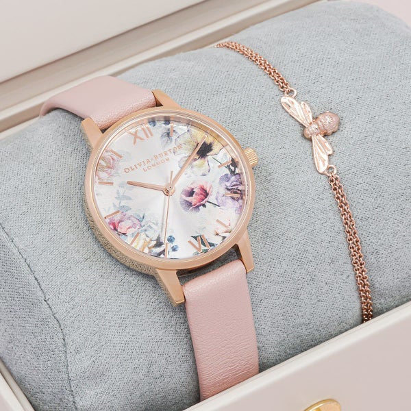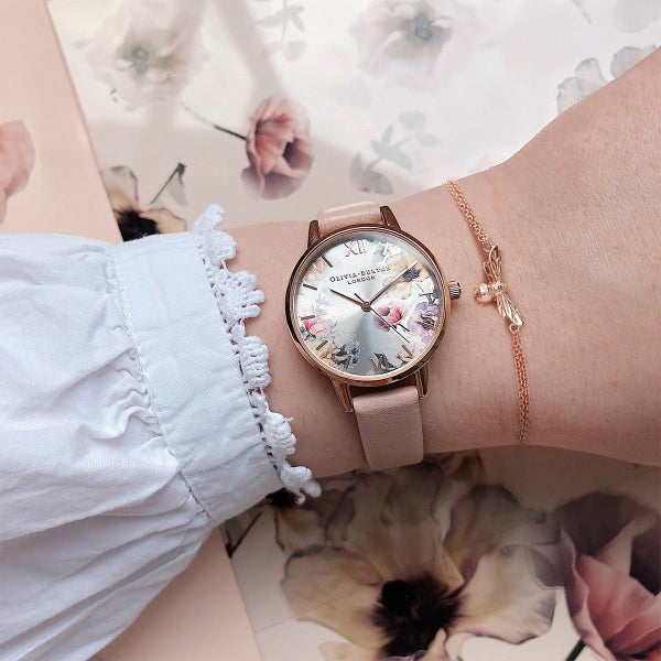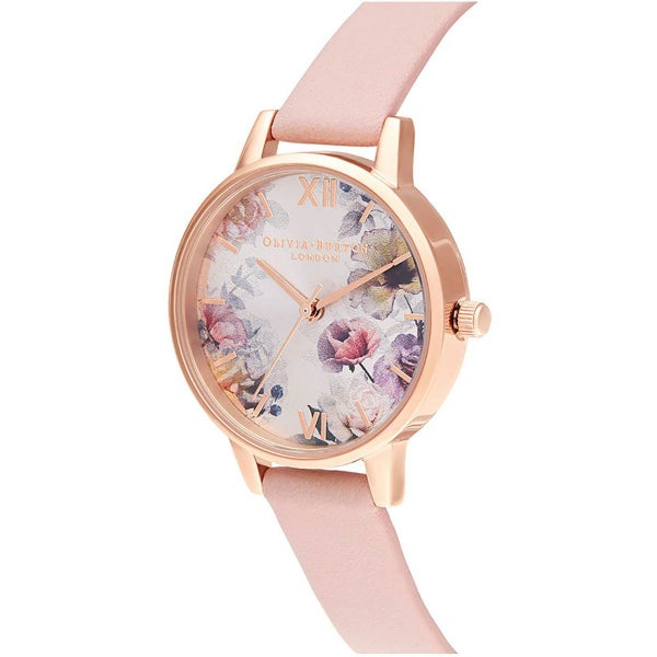 ブラッシュサンレイの文字盤の上には、鮮やかな花束が重ねられているデザイン。フェミニンなダスティピンクのレザーストラップが、華やかな一日を演出してくれるでしょう。