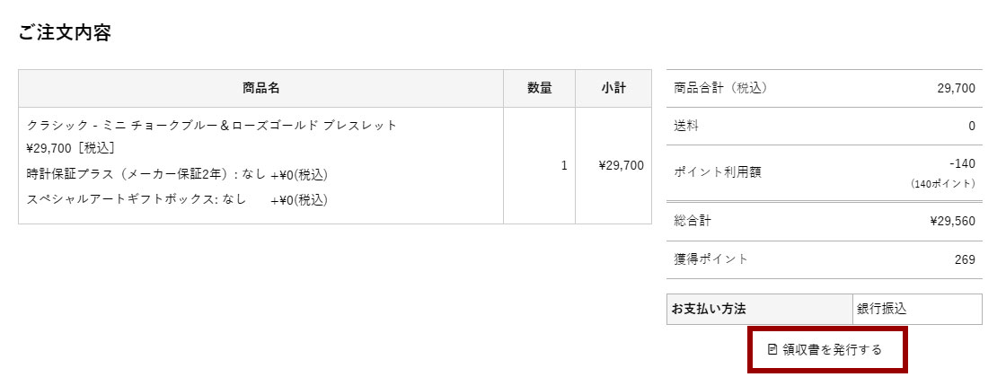 商品お届けののち当店にてご注文完了処理後に、[マイページ>注文履歴>ご注文履歴詳細]に、「領収書を発行する」ボタンが表示されますので、そちらからダウンロードください。